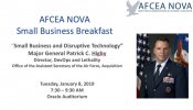 AFCEA NOVA Small Business BreakfastJanuary 8, 20187:30 to 9:30 AM LocationOracle AuditoriumReston, VA SpeakerMajor General Patrick C. Higby, Director, DevOps and Lethality, Office of the Assistant Secretary of the Air Force Acquisition, Technology and Logistics About the ProgramMajor General Patrick Higby will share with attendees information on: Identifying current challenges facing the Air ForceDefining the types of disruptive technology...
